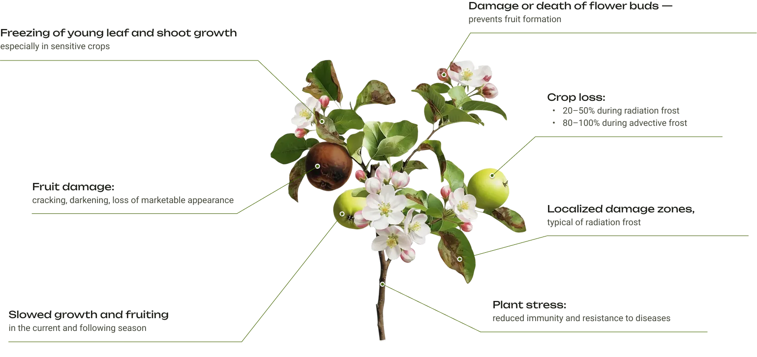 The equipment is effective against both radiation and advective frosts, and the combination of a diesel burner, optimized aerodynamics, and rotation capability allows large areas to be heated without creating “cold zones.”
